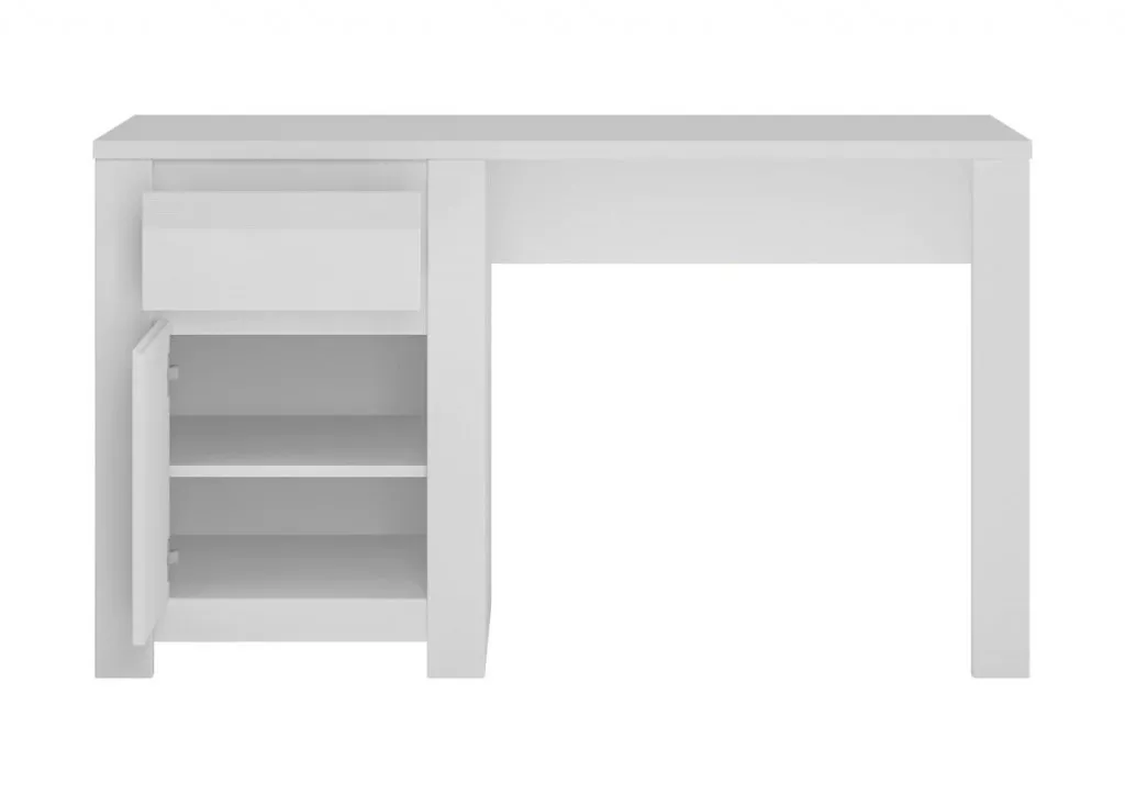 Blat biurka wykonany jest z płyty wiórowej laminowanej odpornej na uszkodzenia, zarysowania, działanie wilgoci i wysokiej temperatury. Pojemna szuflada, przestronna szafka, bezpieczny system bezuchwytowy i ozdobna ryflowana listwa to atuty owego biurka.