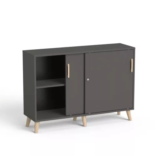 Komoda do biura SV-12 wyróżnia się eleganckim designem. Grafitowa obudowa i drzwiczki połączone z drewnianymi nóżkami i uchwytami prezentują się bardzo gustownie oraz nadają całej aranżacji szyku. Dzięki temu to świetny wybór do gabinetu, prestiżowego salonu czy biura.