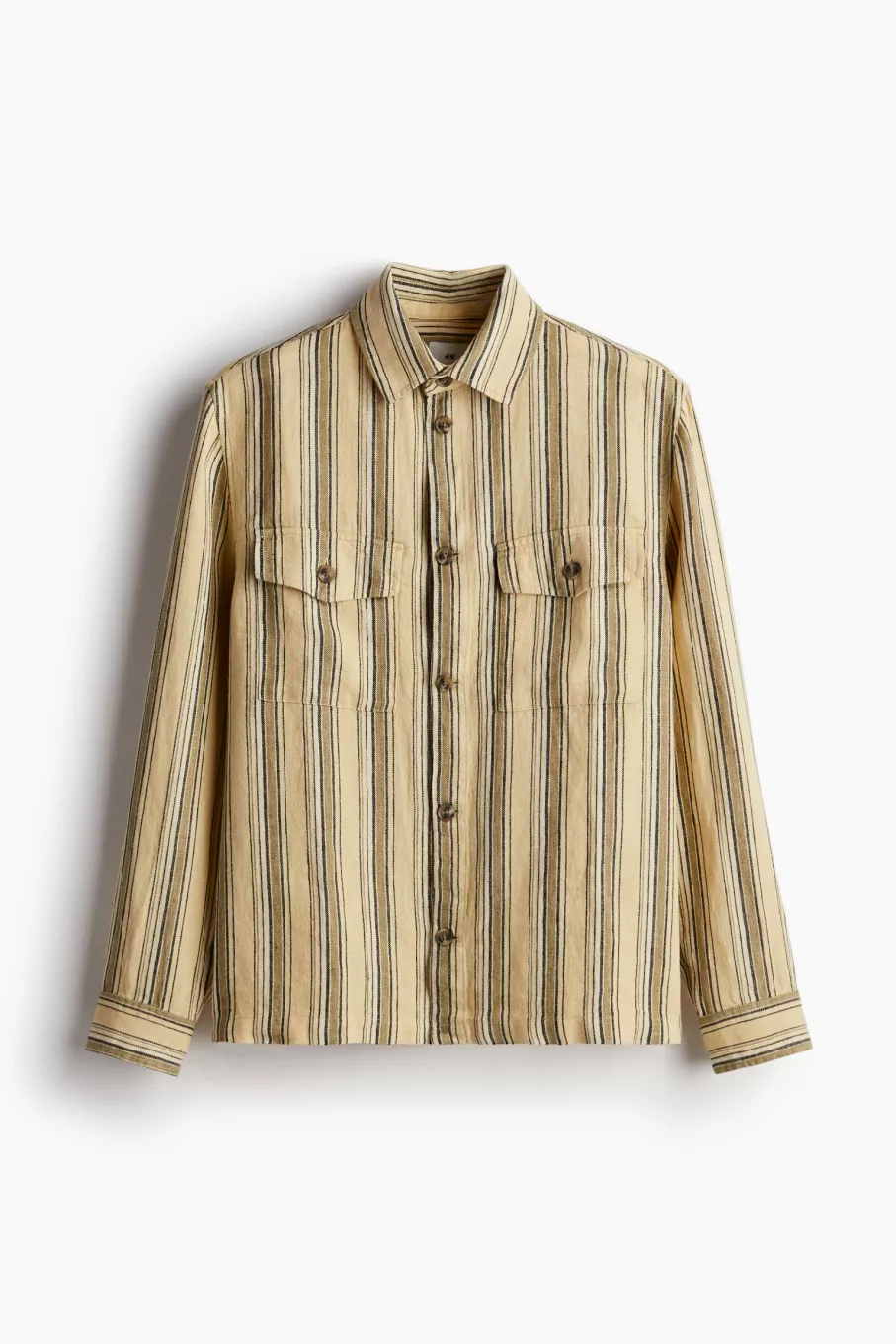 Koszula z przewiewnego lnu. Wykładany kołnierzyk, klasyczny przód, karczek z tyłu. Długie rękawy z zapinanym mankietem, na piersi kieszenie z klapką i guzikiem, zaokrąglony dół. Normalny fason o wygodnym klasycznym kroju. Materiał wykonany z lnu oddycha, wygląda doskonale zarówno wyprasowany, jak i naturalnie pognieciony, a z czasem staje się bardziej miękki.